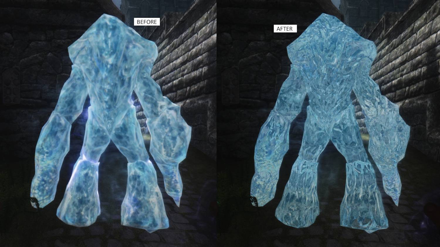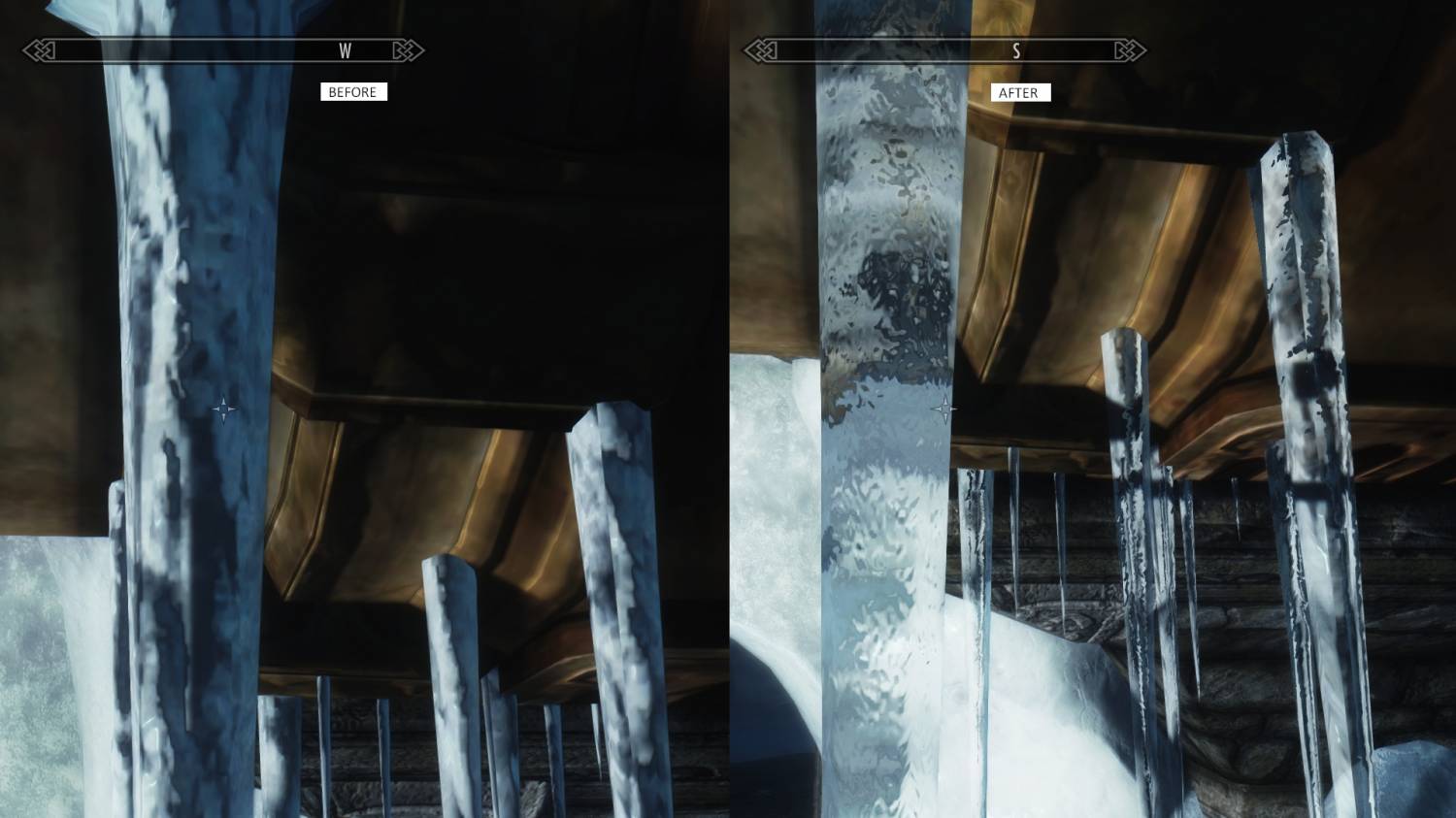 Модификация изменяет стандартный вид "сосулек" и "ледяных атронахов" добавляя им прозрачность.